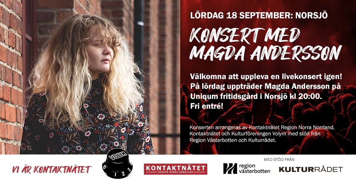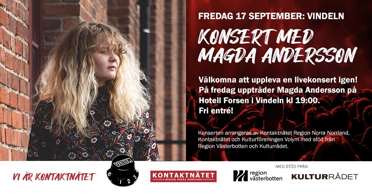 Tillsammans med Kulturföreningen Volym arrangerar Kontaktnätet och Kontaktnätet Region Norra Norrland en konsert i Vindeln med Magda Andersson. Konserten äger rum 17 september 19.00 på Hotell Forsen och kommer endast att kunna upplevas på plats och blir alltså den första planerade konserten inom