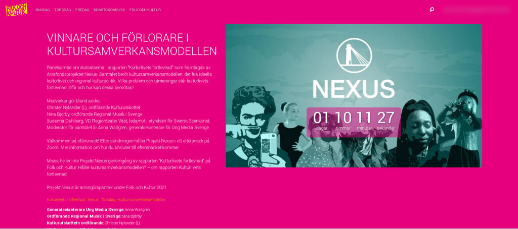 Kontaktnätet är en av de fyra samverkande organisationerna bakom Projekt Nexus, som nu ordnar ett spännande panelsamtal som sänds live på årets Folk och Kultur, torsdag 11 februari klockan 11:25. Panelsamtalet heter ”Vinnare och förlorare i kultursamverkansmodellen” och tar avstamp i rapporten ”Kulturlivets fortlevnad” som nyss släpptes. I samtalet medverkar bland andra ordförande för riksdagens kulturutskott, Christer Nylander (L).