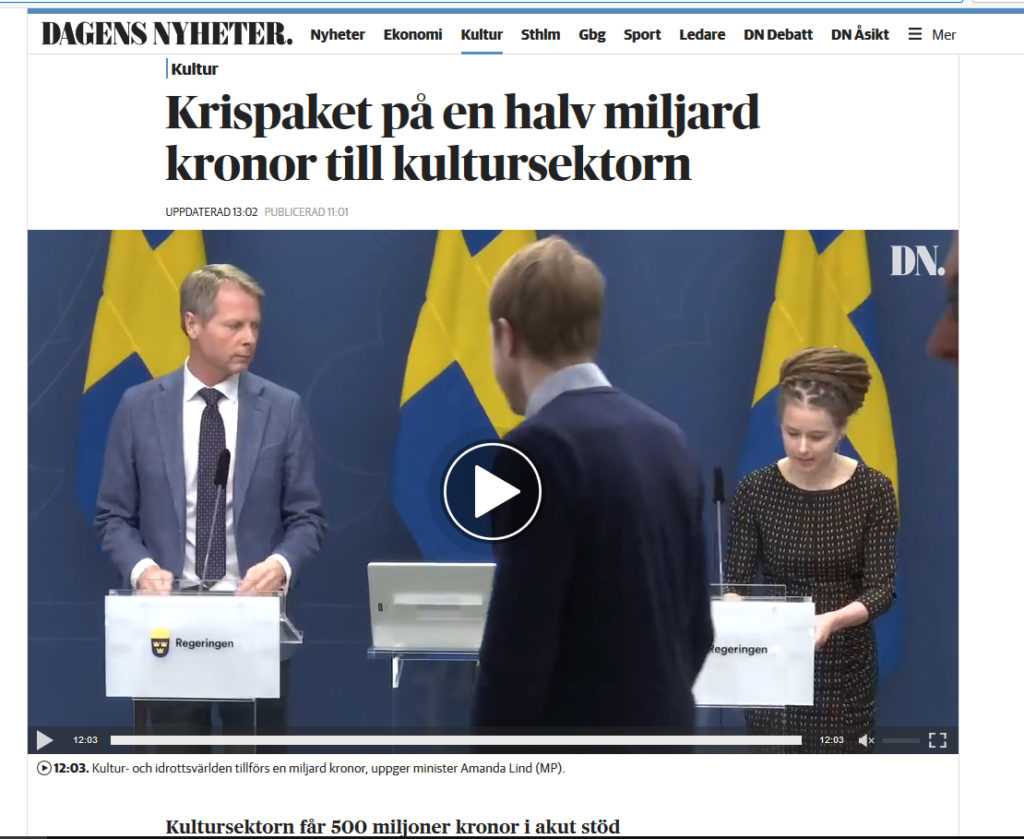 Redan 20 mars presenterade regeringen att de avsätter 500 miljoner i stöd till Kulturlivet. Lite över en månad senare presenterade regeringen nu den 24 april i en presskonferens (kl 12.30) hur de 500 miljonerna i stöd till kulturlivet som utlovats ska fördelas efter regeringens överenskommelse med C och L.